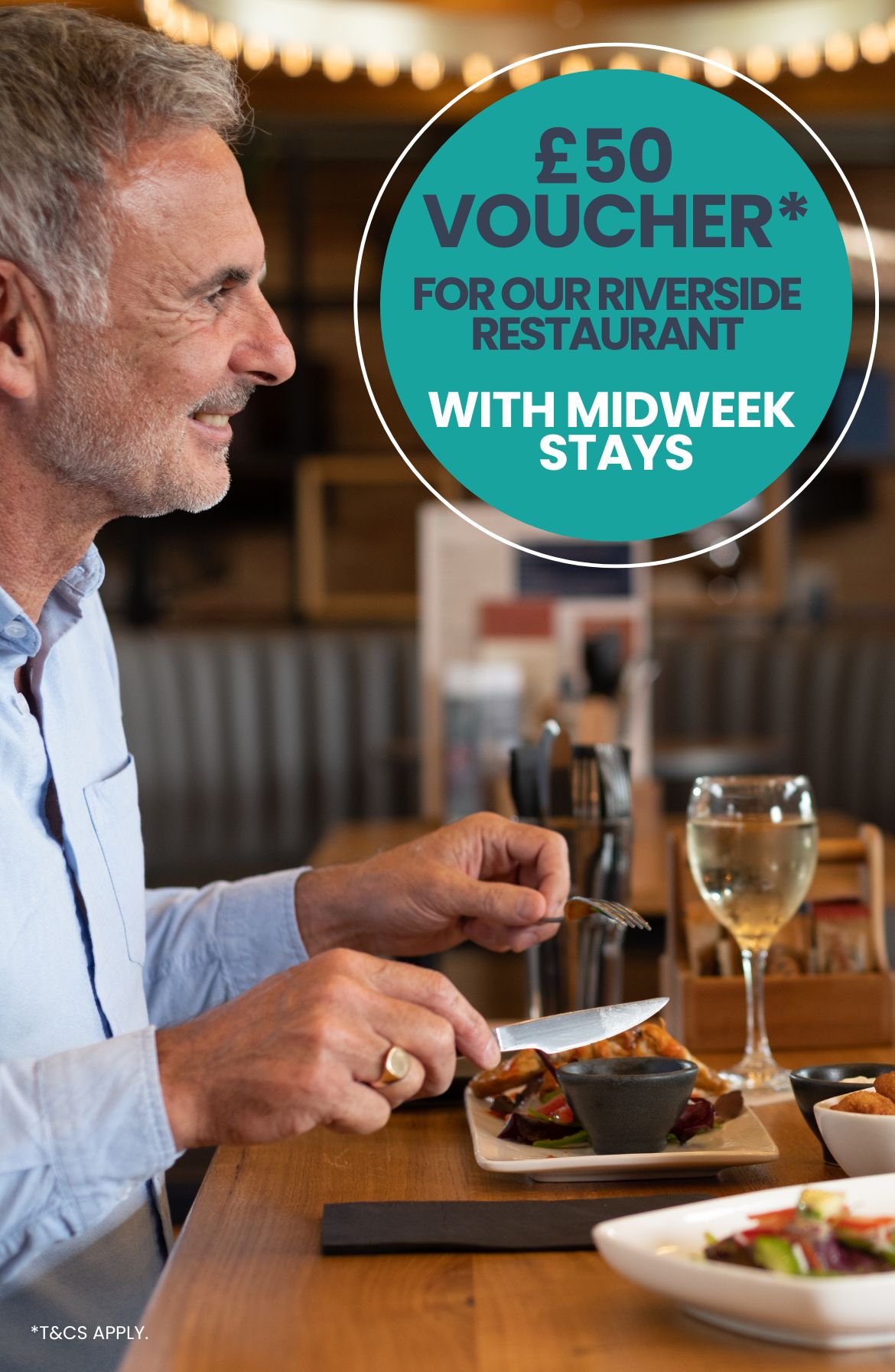 Your £50 voucher can be redeemed towards food at our Riverside Bar & Restaurant, the perfect spot to enjoy a leisurely lunch or evening meal in a beautiful riverside setting.