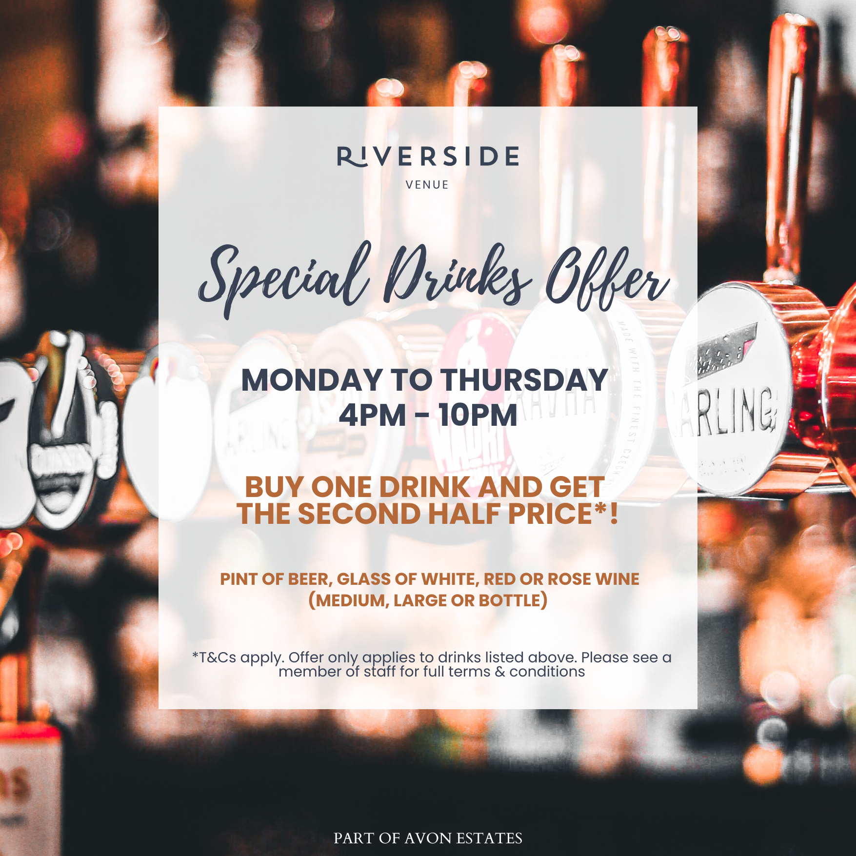 Monday to Thursday, 4pm to 10pm, buy one drink and get the second half price*!