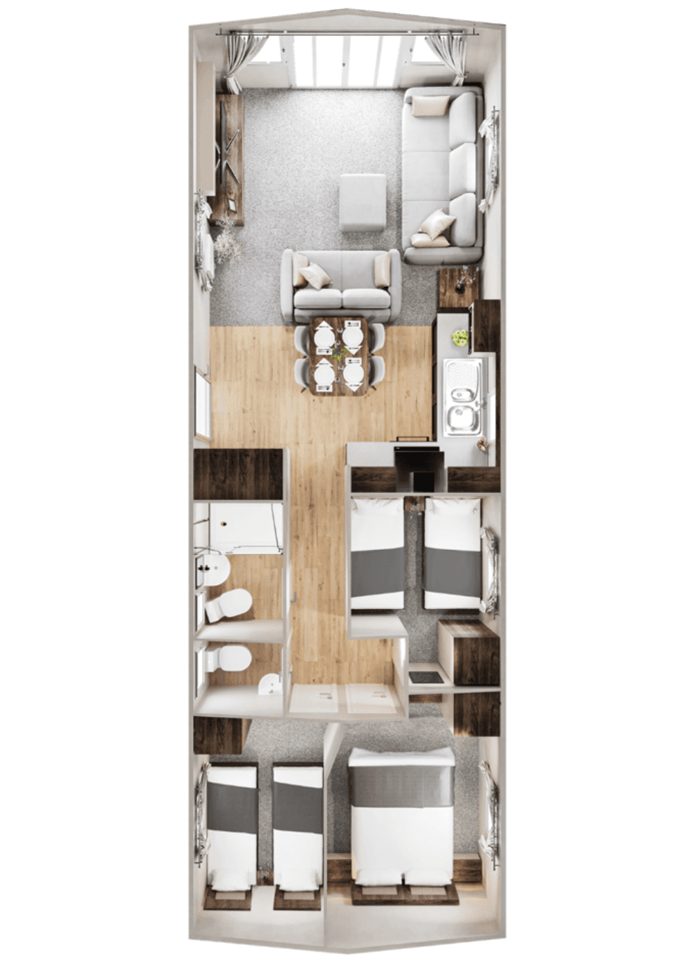 In the bedroom, comfort meets clever storage. The two-bed model even includes a walk-around wardrobe, while the three-bed version offers space for up to eight guests—perfect for larger families or those who love to entertain.