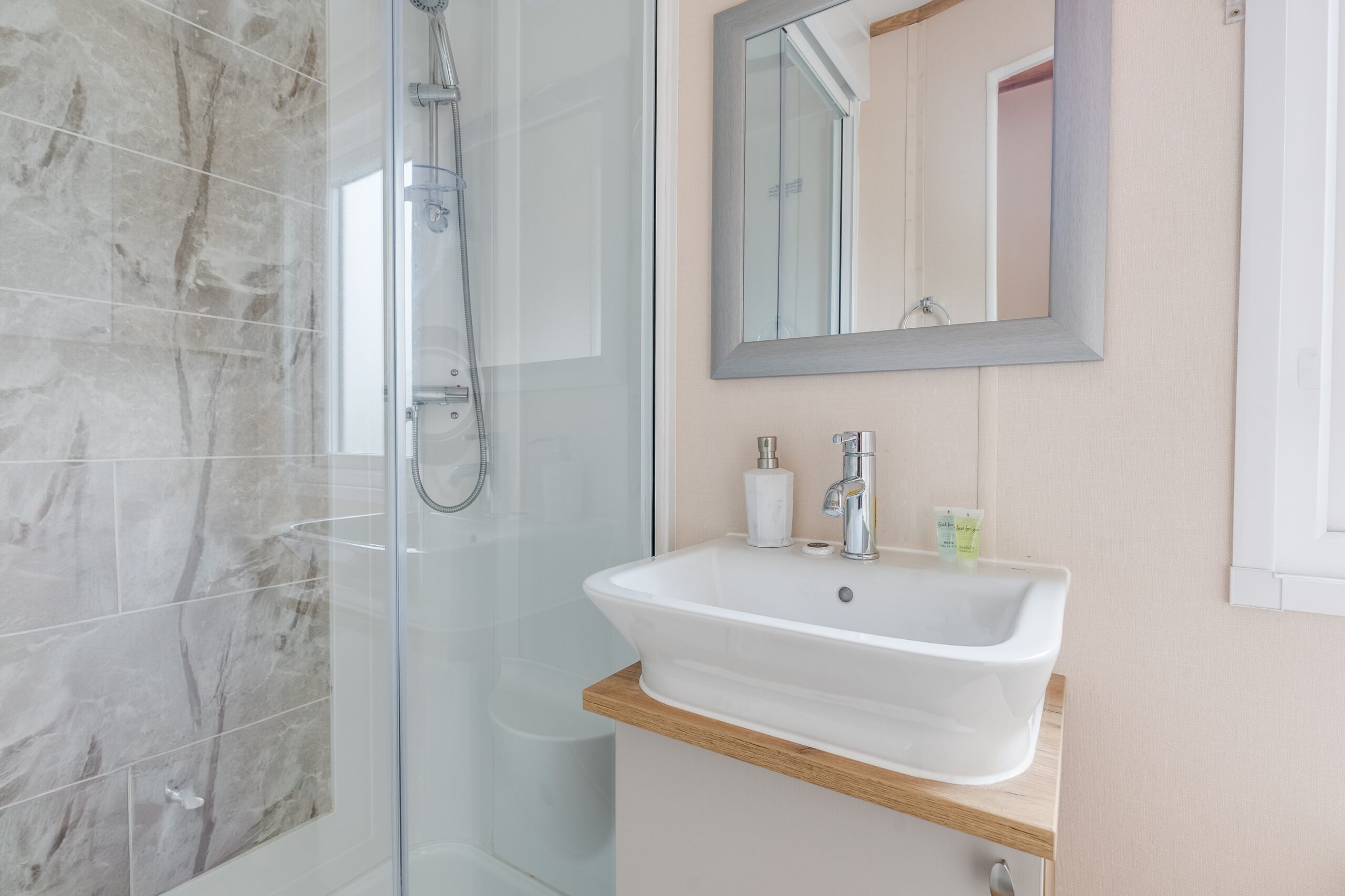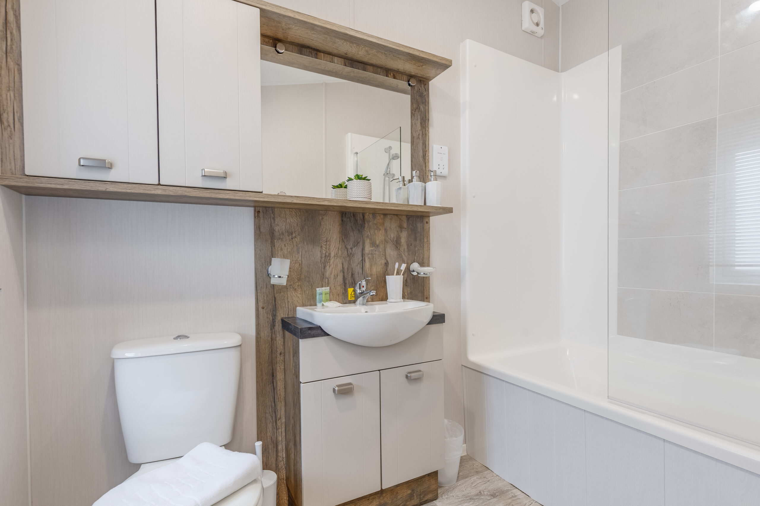 With ramp access, an extra wide doorway, low level work surfaces and sliding doors, our wheelchair accessible unit on our caravan park in Stratford-upon-Avon provides plenty of extra space to ensure moving around isn’t a challenge. With a double bedroom, twin room plus a pull-out sofa bed in the lounge, it comfortably sleeps up to six people and includes a wet room with all the adaptions you would require.